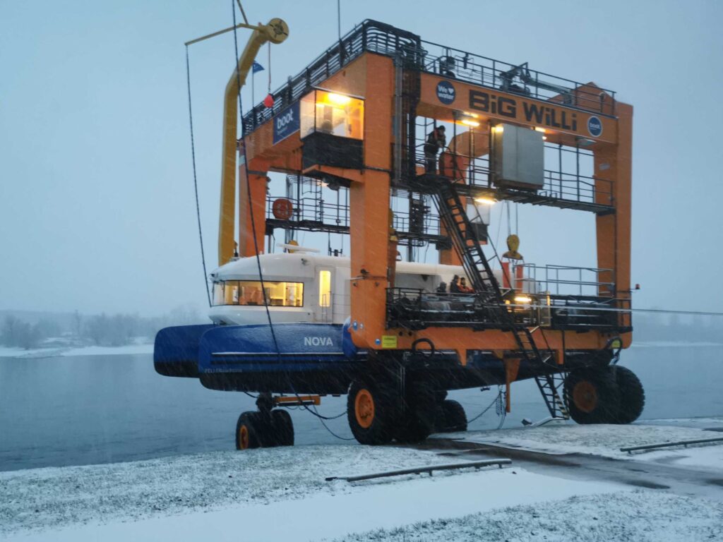 Der Transport von NOVA war ein spannendes logistisches Unterfangen: Trotz starken Schneefalls wurde NOVA auf dem Wasserweg von Duisburg nach Düsseldorf gebracht, dort am Messegelände vom Kran „Big Willi“ aus dem Wasser gehoben und anschließend in die Messehalle überführt.
